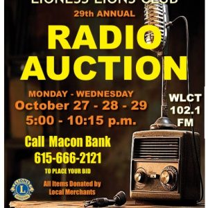 The 29th Annual Lafayette Lions & Lioness Lions Club Radio Auction will be held Monday, Tuesday and Wednesday, October 27, 28, 29. Tune-in to WLCT 102.1 FM each day, from 5:00 p.m. to 10:15 p.m. and call Macon Bank & Trust at 615-666-2121 to submit your bids on a variety of items and services donated…