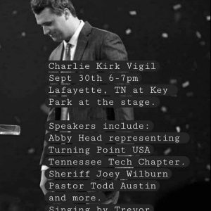 A Charlie Kirk Vigil will be held on September 30, 2025 at Key Park in Lafayette, Tennessee, from 6 – 7 p.m., with speakers: Abby Head, representing Turning Point USA Tennessee Tech Chapter; Macon County Sheriff Joey Wilburn; and Pastor Todd Austin, and singing by Trevor Swindle. The lady behind this memorial event planned in…